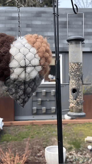 A hanging holder filled with soft, natural fiber. Birds pull small pieces to line their nests, improving insulation and comfort for eggs and hatchlings.